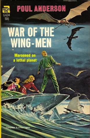 From the back cover: “When three Terrans — a space pilot, a planetary queen and an obese tycoon — crash-landed on Diomedes, they realized that the chances for survival were quite slim. The native food was totally poisonous to humans, and the survivors had only six weeks’ worth of supplies to get them across thousands of miles of unmapped territory to the one Terran outpost. Their only hope was the enlist the aid of the winged inhabitants of Diomedes, and these barbarian tries cared only for battle and glory. There was little little that could induce them to worry about the lives of three humans….”