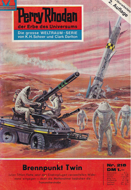 • Not that particularly installment, but later on I did read the series for a while – there really is not way around if you’re at all interested in Science Fiction in Germany. They still seem to be going strong, at least they’re all over the Sci-Fi e-book section on Amazon.de. It’s pretty awful stuff, but seeing how it likely got quite a few people interested in Science Fiction who otherwise might never have touched it, one can’t dismiss it completely.