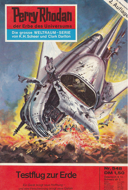 (Johnny Bruck’s cover for the 1972 edition of Perry Rhodan, #548 Testflug zur Erde (1972), H. G. Francis)