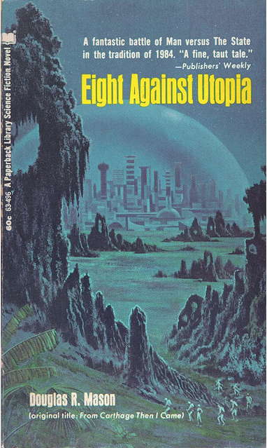 Eight Against Utopia (1966) is the second escape from a domed city novel published by Paperback Library I’ve read — the first, Rena Vale’s Beyond the Sealed World (1965) was a truly dismal “adventure.” Mason’s take on the theme is only marginally better. The first half, life and escape from the domed city of Carthage, is more intriguing and engaging than the second half, an endless unexciting chase sequence along the coast of North Africa. Mason’s novel is painfully flawed in its social theory and mechanics of delivery. Even on the level of a future adventure tale, most of Eight Against Utopia fails to conjure a modicum of excitement and wonder.