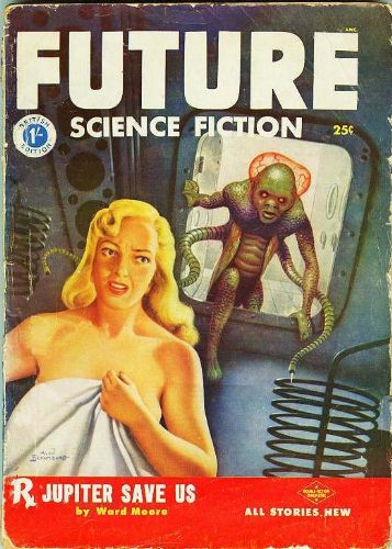 When we conjure the image of a 40s/50s science fiction pulp heroine we often imagine a character who has to be rescued by men from aliens, shrieks and clings to any man nearby, and is always in a state of undress.  I’ve included one cover, for the sake of comparison, that I find to be an exemplar of this type of sexist (and racist) depiction below (Alex Schomburg’s cover for the January 1954 issue of Future Science Fiction): white woman wrapped in only a towel stalked by an evil alien obviously painted with African-American facial characteristics (heavy on the sexual predation vibe) — the reader is supposed to buy into the racial stereotypes and thus be titillated by the fear she must feel.