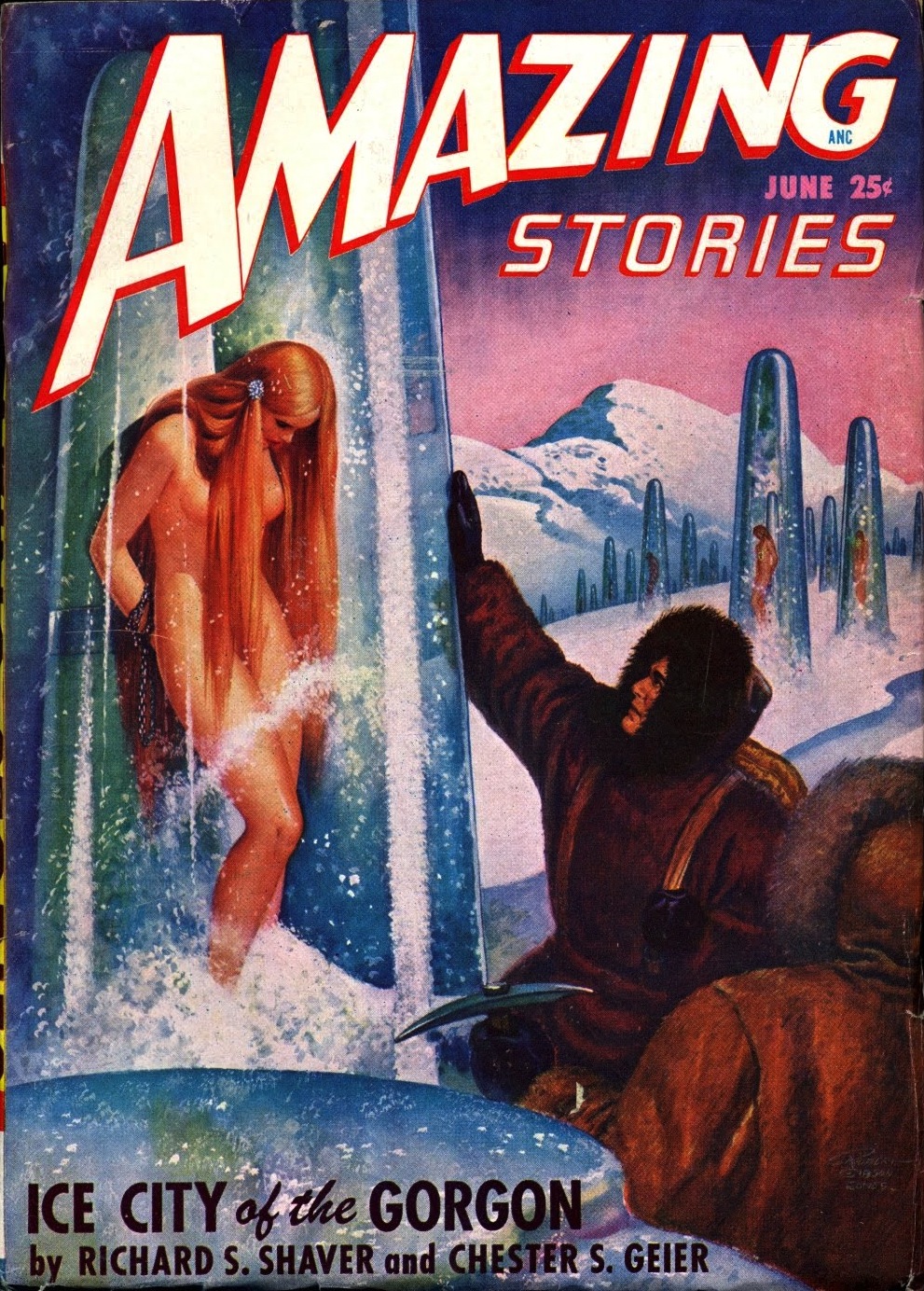 This post is somewhat thematically similar to my earlier post on humans trapped in mysterious vials (here).  The glass or crystal pillar is often just another way for a heroine to be imprisoned by some malevolent entity — waiting for the hero to come to rescue.  For example Robert Gibson Jones’ wonderful pulp cover for the June 1948 issue of Amazing Stories.  Although, the countless similar pillars across the horizon imply an entire city of people imprisoned in ice…