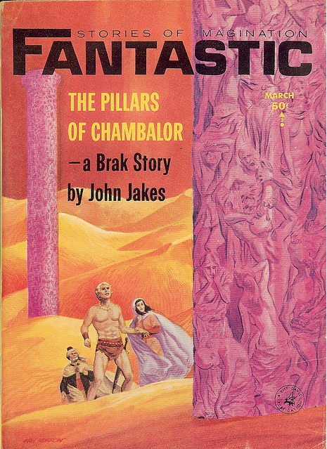 Some of the covers are even more mysterious — in Gray Morrow’s cover for the March 1965 issue of Fantastic Stories of Imagination hundreds if not thousands of people are crammed into the pillars (or carved, but, I haven’t read the John Jakes short story).  Pillars of warning?  Pillars memorializing tragedy with the actual bodies of the victims?