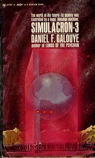 From the back cover: “The word of the future built its policies on public-opinion samplings!  But Rien Reactions, Inc. — realized that old-fashioned public-opinion polls were too slow, inaccurate, and unstable on which to base a conforming society.  So scientific researchers Morton Lynch, Hannon Fuller, and Douglas Hall built a total environment simulator — SIMULACRON-3 — into which they fed subjective analogs and got human reaction results… But Lynch disappeared, Fuller was murdered, and Hall was charged with both crimes!  Then Hall discovered that his world was nothing but a total environment simulator for a governing world as large as his was to his own miniature simulator world — and that he was marked for extinction!”