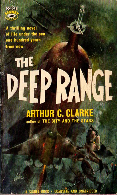 From the back cover of a later edition: “A happy blend of Mr. Clarke’s impressive talents as astronomer, deep-sea naturalist, and novelist, The Deep Range takes place in an unusual setting, the depths of the sea, about a hundred years in the future.  At this point in time the earth’s population is fed principally from the sea, on whale products and the yield of plankton farms.  The hero of the story is a grounded spaceship engineer assigned to a submarine patrol tending the whale herds.  Separated forever from his family, natives of the Mars colony, who cannot make the adjustment to Earth, he is compelled to redesign his whole life.  In his new environment he soon finds, as will the reader, excitements and problems no less engrossing than those of space.”