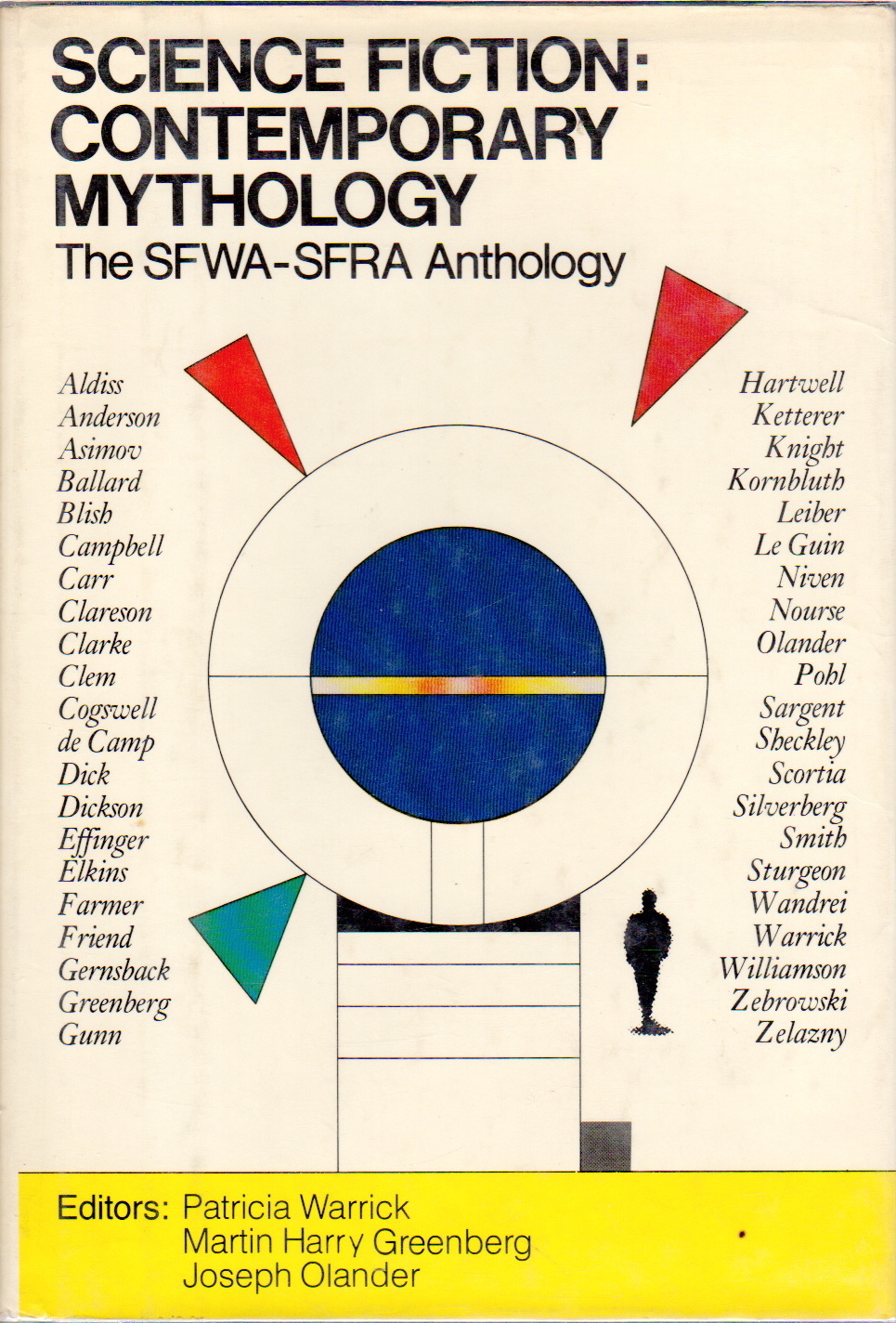 (Mark Rubin’s cover for the 1978 edition Science Fiction: Contemporary Mythology: The SFWA-SFRA Anthology (1978), ed. Patricia Warrick, Martin Harry Greenberg, and Joseph Olander)