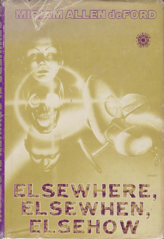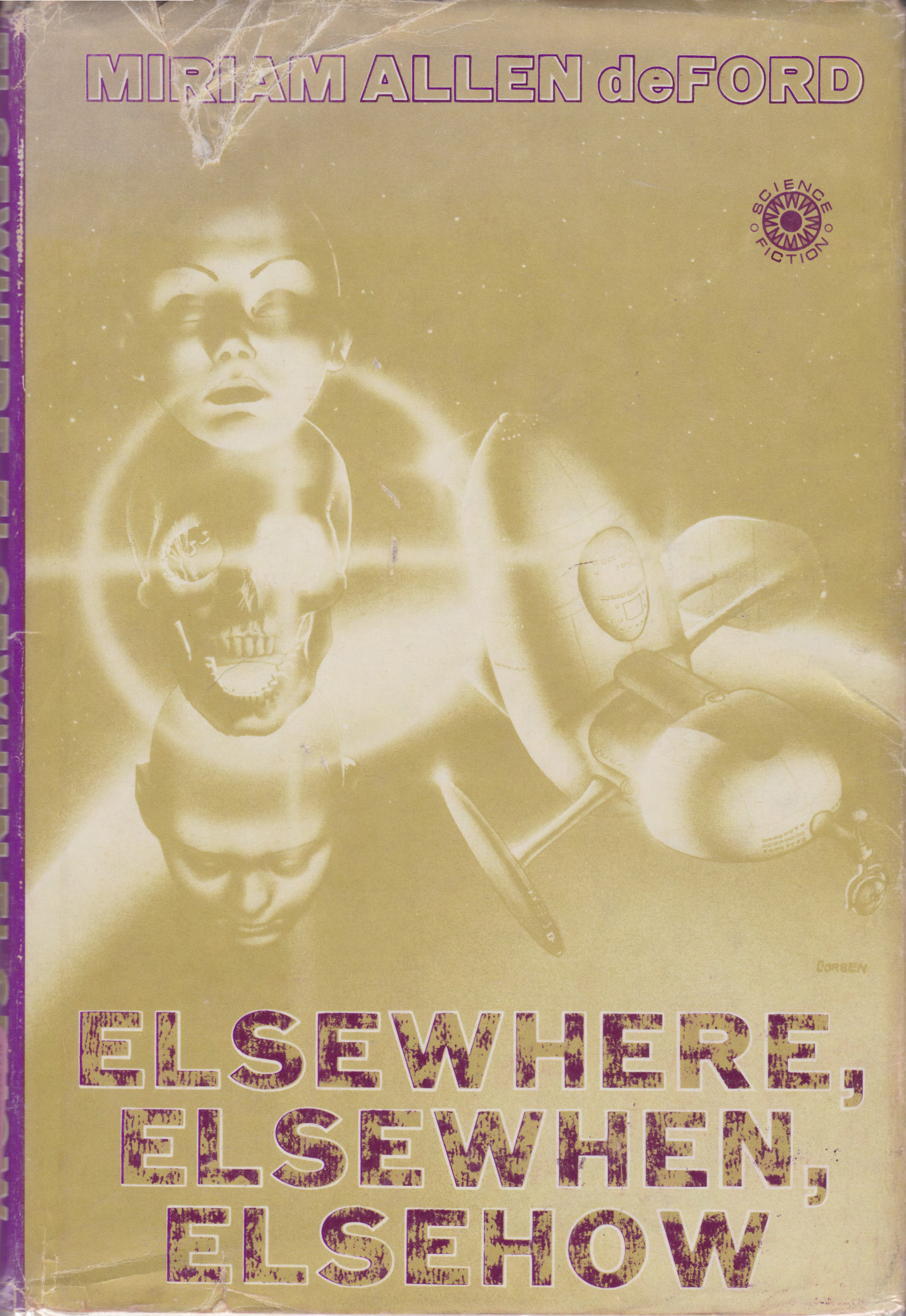 From the inside flap: “ELSEWHERE, ELSEWHEN, ELSEHOW i a definitive collection of fantasy and science fiction stories by one of the all-time greats in the field. Miriam Allen deFord, the doyenne of the San Francisco Bay Area Science Fiction Group (which included the late Anthony Boucher, J. Francis McComas, and Poul and Karen Anderson) introduces us in these stories to the living and to the dead—the dead who no longer have reason to fear the heat of the sun—and the living, here on Terra and on other worlds, who live in the shadows of a fear as old as, if not older than, the human race. These are chilling hints of the possible Tomorrows which we ourselves will perhaps never know, but which those who will come after us will have to live with….