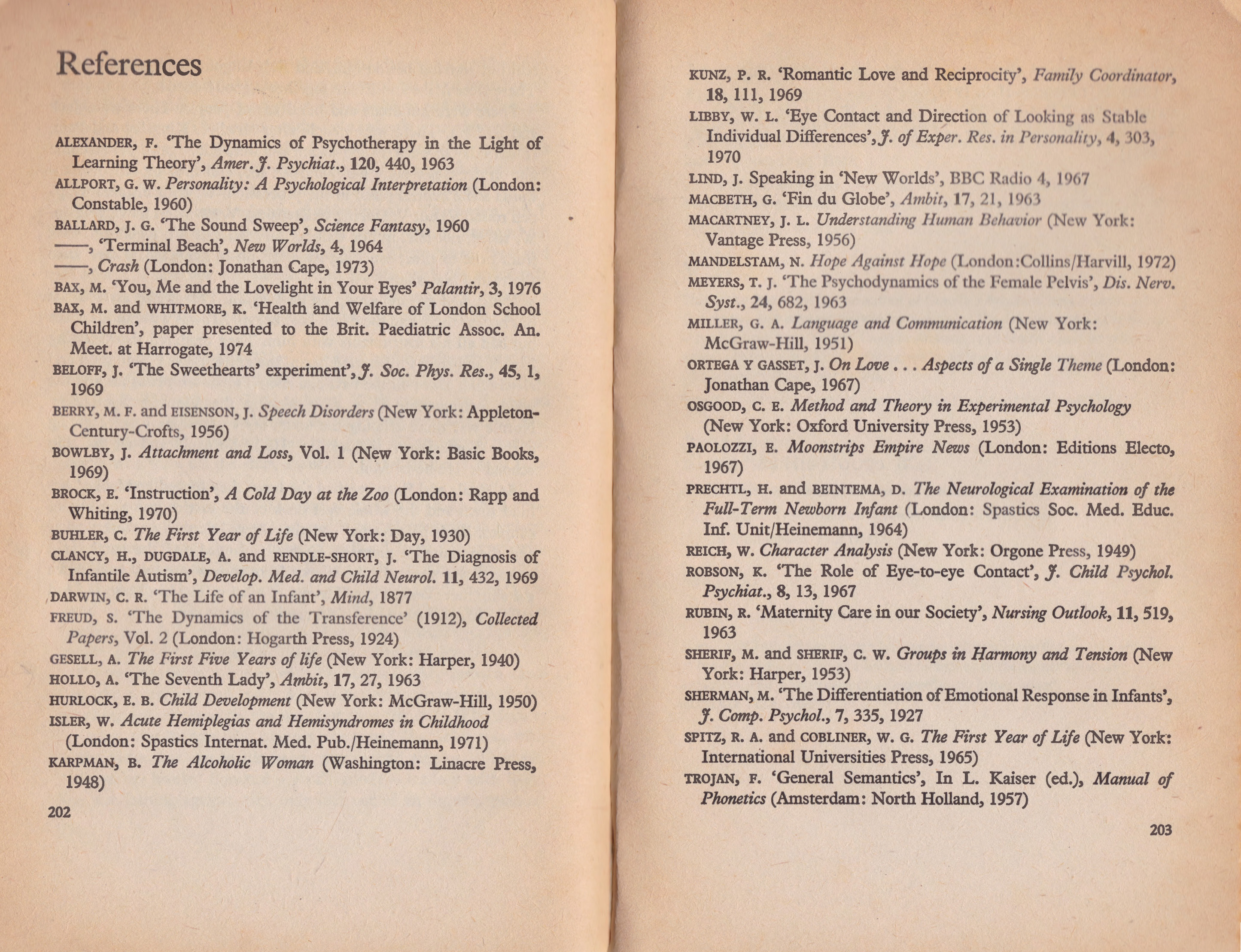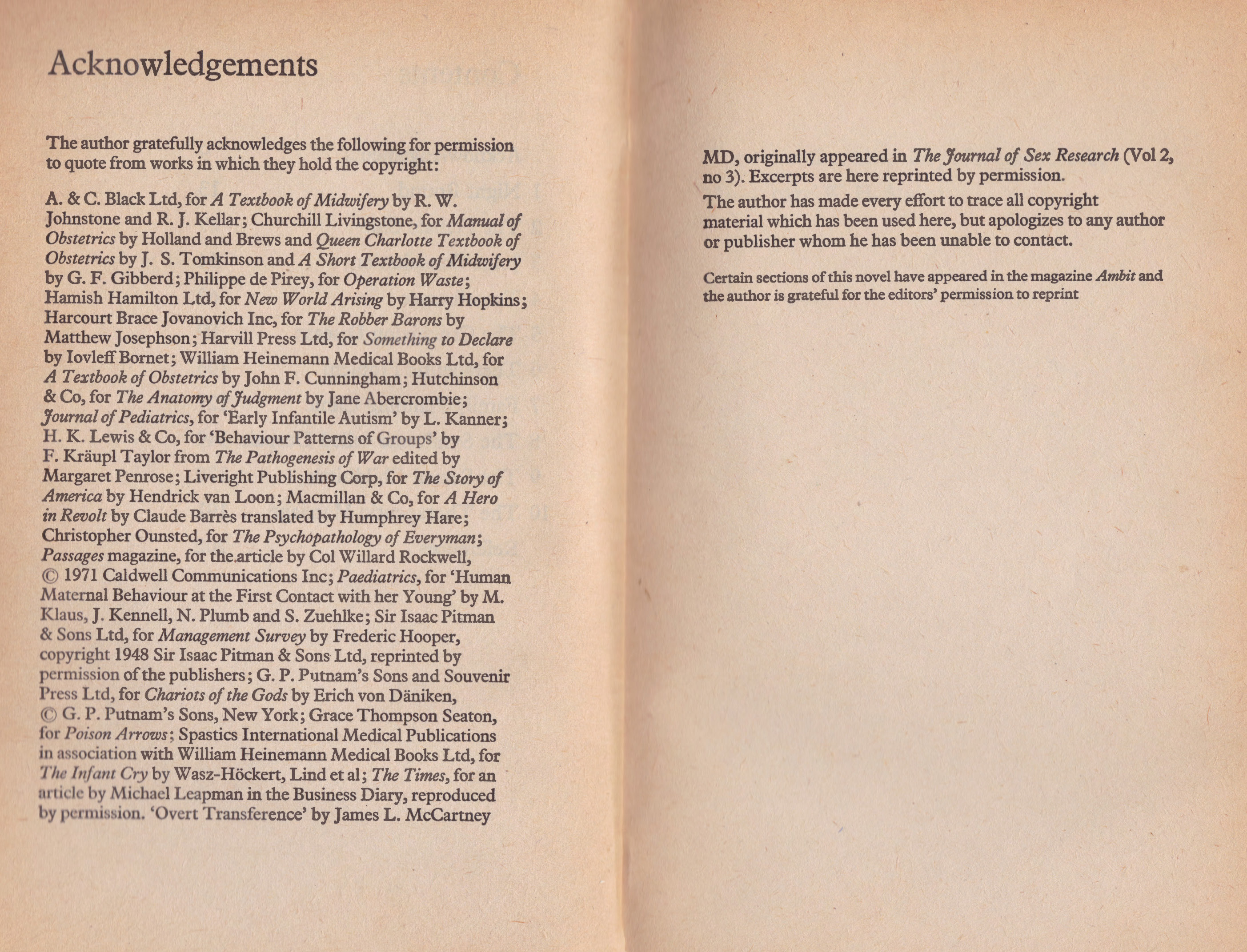 Bax’s use of quoted texts, which gain meaning through association with other quoted texts and the novel’s narrative portions, is the most ingenious (and challenging) element of the novel (see note 2). Quoted texts make up around a third of the novel and are not cited (but a list is provided at the beginning). The range demonstrates Bax’s medical training and other reading habits: from K. Kräupl Taylor’s “Behavior Patterns of Groups” in The Pathogenesis of War (1963), ed. Margaret Penrose to The Robber Barons (1934) by Matthew Josephson.