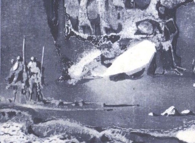 The four credited covers of Philippe Jean for the French SF magazine Fiction (between 1963-1964) show remarkable clarity of vision. Each explores the patina of decay made manifest in a haunting landscape that stretches across the page, still inhabited by small figures who weave among the ruined buildings and statuary. The detail from Fiction, #133 below shows a decaying recumbent form amongst brittle shadows of the masts of stranded ships — small human figures move around it.