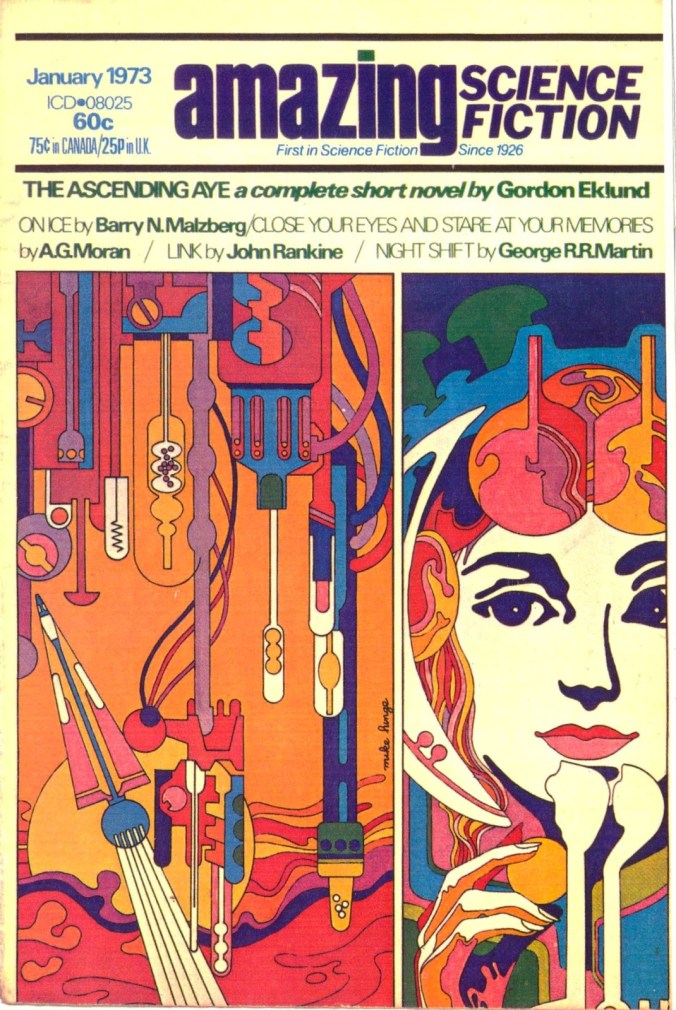 Mike Hinge (1931-2003) combined a distinct 70s pop art visual aesthetic with SF themes to great effect. For the general public in the early 70s, he was best known for his Time Magazine covers (Nixon, November 5, 1973, “The Push To Impeach” and Emperor Hirohito, October 4th, 1971, “It’s Tougher World for Japan”).