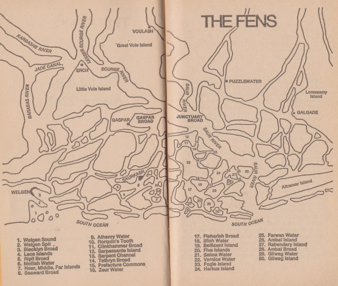 Let’s start off with a simple yet effective map via Jack Vance. Islands, and rivers, and swamps….