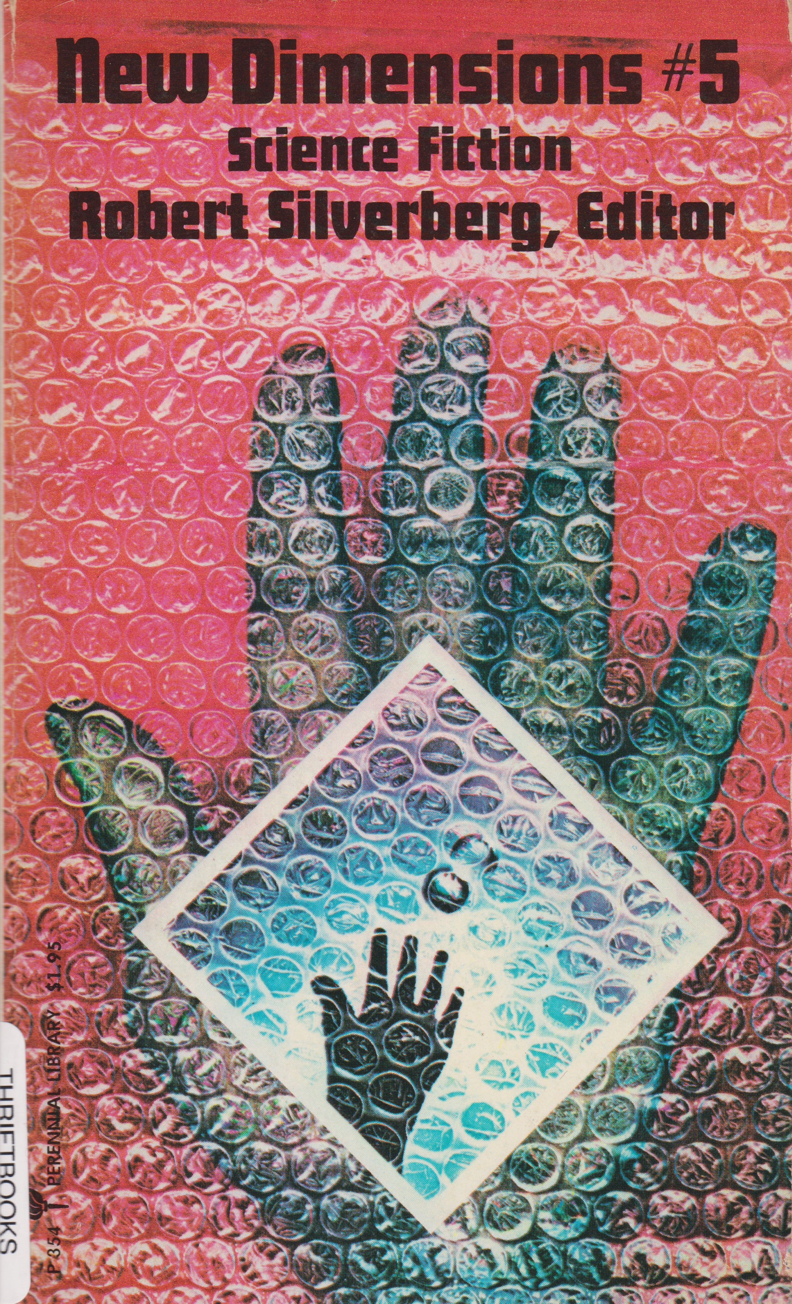From the back cover: This is the fifth volume of what is widely regarded as the best of the all-original new writings in science-fiction anthologies. Mr. Silverberg is a renowed veteran of the science-fiction field. As a writer, he has won the Nebula Award four times and the Hugo Award twice. As an editor, Silverberg has the most imaginative, lively, and discerning eye in the business, as is demonstrated by the consistently positive response of readers, writers, and fans. The stories in the New Dimensions volumes have been frequent award nominees and New Dimensions #3 contained two of the 1974 Hugo winners.