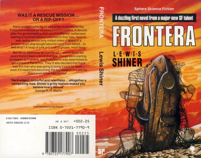 Lewis Shiner’s Frontera (1984), a paranoid romp across post-democratic landscapes (both Earth and Mars) of decay and corporate takeover, contains a hypnotic premise and a not entirely convincing plot. Be prepared for a maelstrom of ideas and images: Subliminal messages. An abandoned Martian colony. Implanted Biological RAM. A dangerous voyage to Mars in old NASA shuttles. Corporate mercenaries. Hyper-violence. Mutant children. Transcendent mathematics.