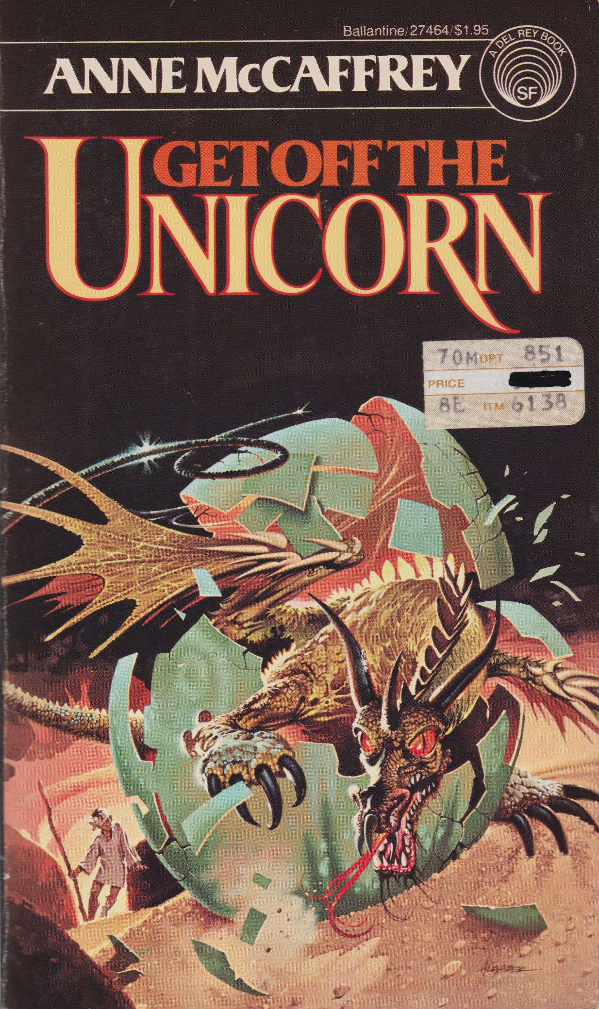 3. The title of Anne McCaffrey’s collection Get Off the Unicorn (1977) was derived from a humorous misprint. According to the collection’s introduction: “The title was derived by accident: McCaffrey’s working title had been “Get of the Unicorn” but this was misprinted as “Get Off the Unicorn” in Ballantine’s roster of unfilled contracts. After McCaffrey’s editor, Judy-Lynn del Rey, was repeatedly asked what “Get Off the Unicorn” was, del Rey asked McCaffrey what she could do about that theme.”