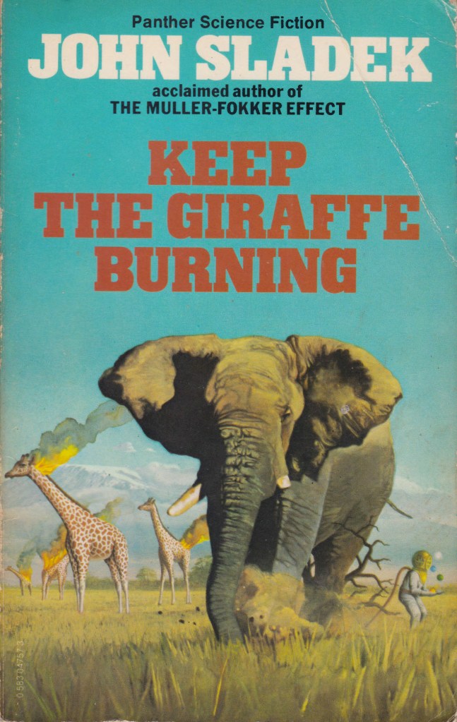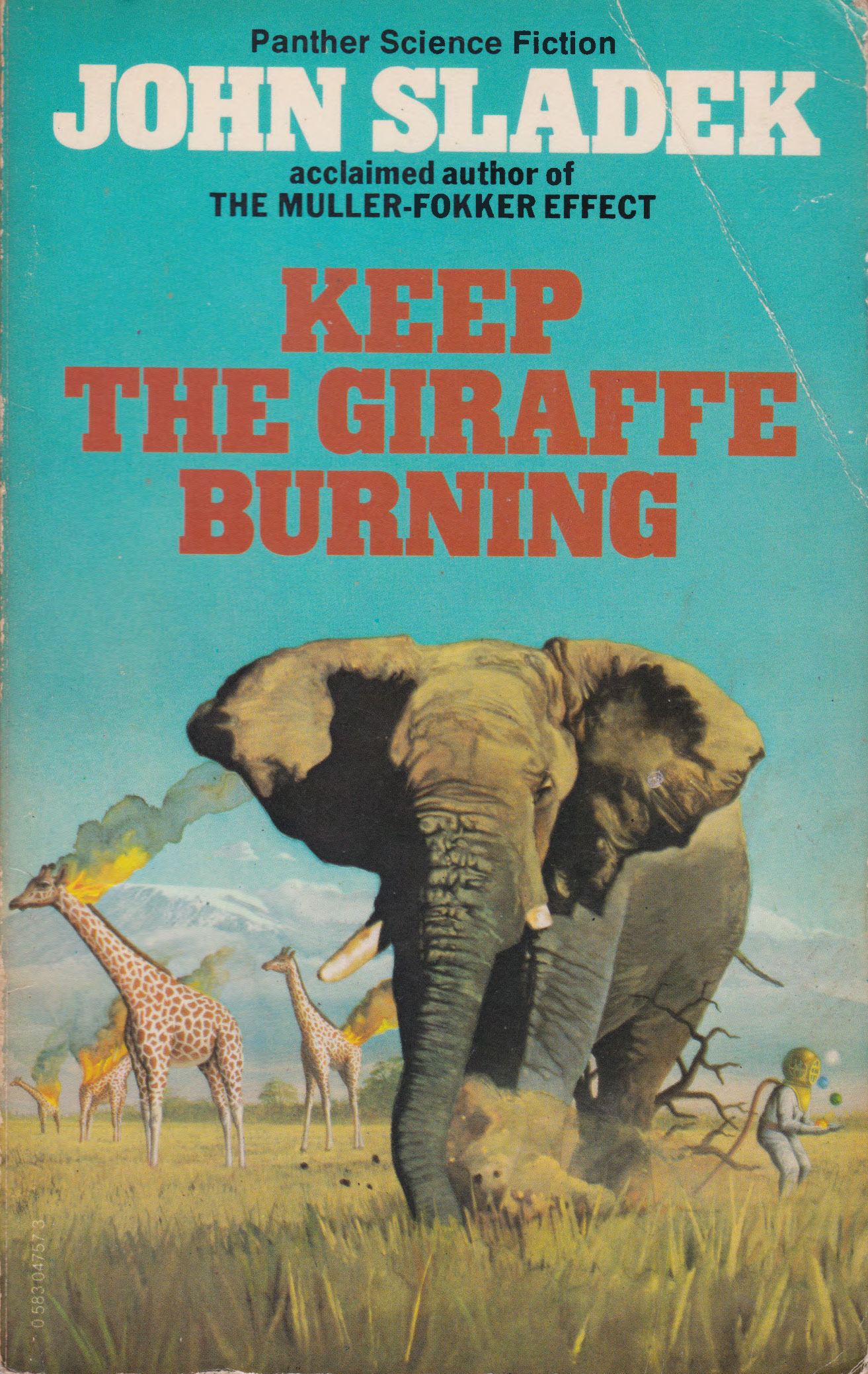 (Peter Goodfellow’s cover for the 1977 edition if Keep the Giraffe Burning (1977), John Sladek)