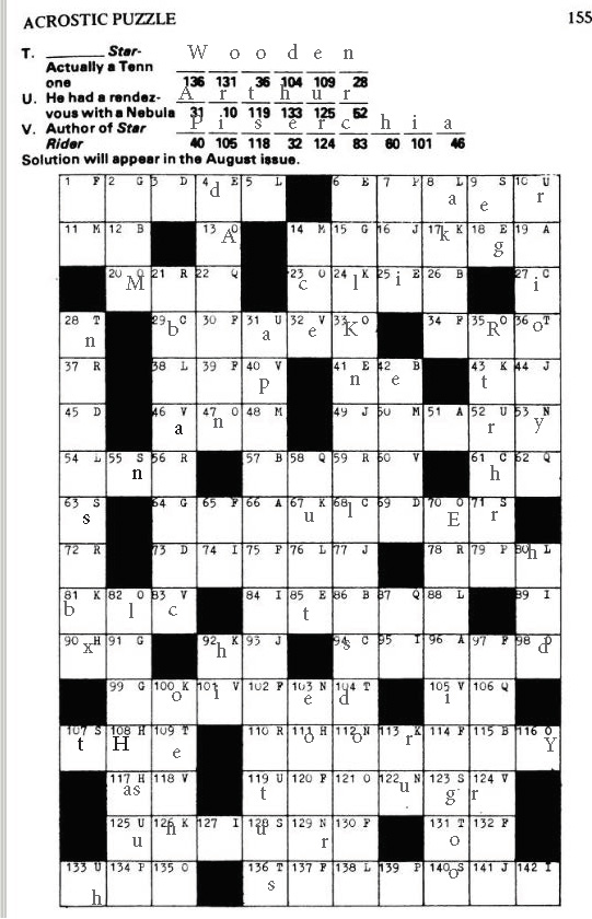 Let’s solve a SF acrostic from the July 1975 issue of The Magazine of Fantasy and Science Fiction together! Put your answers in the comments. Here is a link to the original. Prove your SFF knowledge 1975 style! (hah)