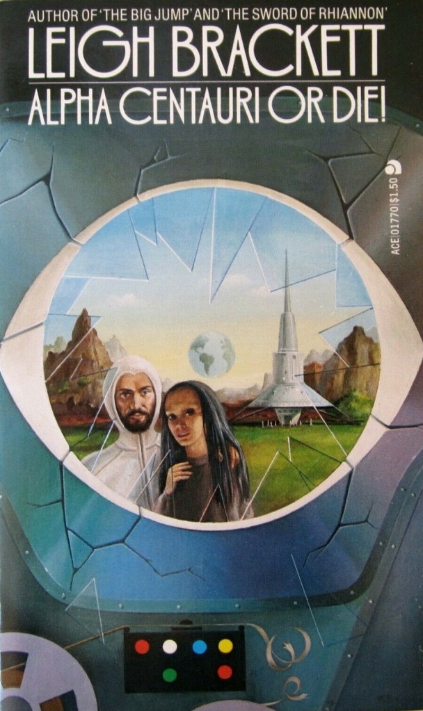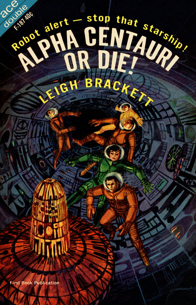 Let’s get the obvious out of the way. As I mentioned above, this is not a generation ship story despite its inclusion in the SF Encyclopedia’s entry on the theme. While mothers and children are brought on board a massive vessel secretly constructed on Mars for a journey to an Earth-like planet orbiting Alpha Centauri, the voyage lasts a mere five years. Children might be born on the ship but will only spend a short portion of their lives on board. All of the action of the plot revolves around launching the vessel and Mars’ last attempt to stop the trip immediately as it sets off. Few of the distinctive hallmarks of generation ship stories are present — there’s no generational strife between those born on the ship and their elders, no conceptual breakthrough as the “true” nature of the world is revealed, etc. Instead, the ship is a glorified covered wagon, symbolic of Brackett’s identification of a primitivist masculine drive (with adjacent spouses) to trek West rather than a new social system to explore.