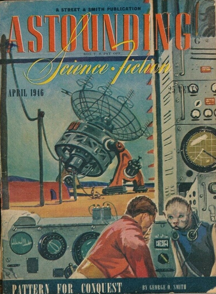 4. Paul Williams, in the third volume of the complete short fiction of Theodore Sturgeon, says “Memorial” was possibly written in January 1946, but given that it appeared in the April 1946 issue of Astounding (which means it would’ve been shipped out to newsstands in March), it’s more likely that it was written in late 1945, making it one of the very first post-Hiroshima SF stories. Functionally it’s little more than a Socratic dialogue, not as ambitious as later Sturgeon stories, but it does have a genuine paranoia.