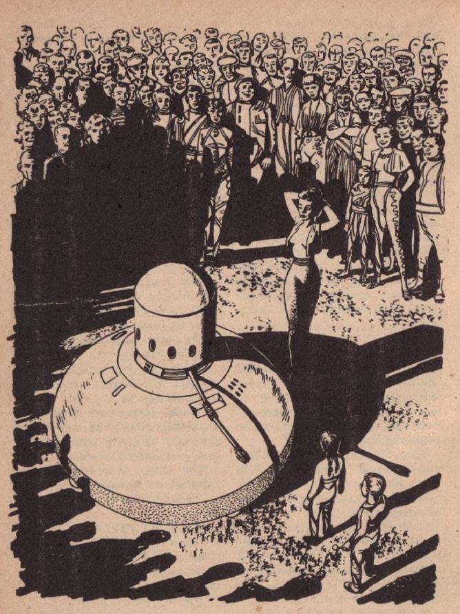 As with “The Girl with the Hungry Eyes,” Leiber explores the disquieting eroticism of consumerism and advertising media. Crowds ogle the “fifty-foot-tall” billboard models dressing and undressing, dressing and undressing (112). Robie’s automated attempts to sell his products–Poppy Pop and comic books—are described in the same terminology as a prostitute turning a “trick” (116). He’s programmed to whistle at attractive women. Women display their bodies in front of his sensors. His prepared advertising soundbites and wares seethe with sensuality–from the “seductivizing Mars Blood” perfume that exudes the “passionate claws” of a Martian sunrise (116) to Gee-Gee Jones, Space Stripper (115), a SF comic book for young girls.