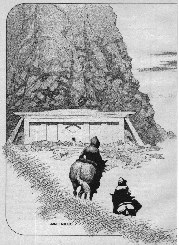 Another element that I appreciated was the physical landscape of McIntyre’s post-apocalyptic Earth. One gets the sense that only a handful of humans survive in tribal groups and small settlements across the wastes. The Healers provide connection and care through their wanderings. And the remnants of old beliefs remain holed up (physically and metaphorically) in the City (illustration below). Their adherents still maintain contact with what I assume are humanity’s colonies across the solar system. But this is an Earth transformed. Nuclear craters scar its surface (56) and broken domes with alien plants (and animals) divulge their contents across the loam and sands. There’s a profound sense of distance and of humanity’s slow attempt to rechart and redocument the strange new land.