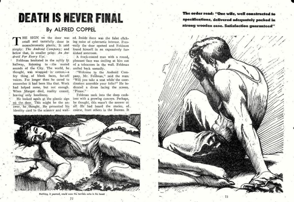 Alfred Coppel’s “Death Is Never Final” first appeared in Fantastic Adventures, ed. Howard Browne (October 1952). You can read it online here.