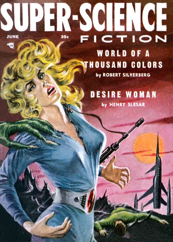 A sinister, if forgettable, take on egotism and the overwhelming desire to change. I’ve always enjoyed Silverberg’s fascination with anti-heroes. As the editor of Super-Science Fiction accepted (virtually) anything from Ellison and Silverberg to fill his page quota, they probably sent this style of off-handed despair and violence without positive resolution knowing they’d receive a check. Check out Harlan Ellison’s “Psycho at Mid-Point” (1956) for a more extreme example.