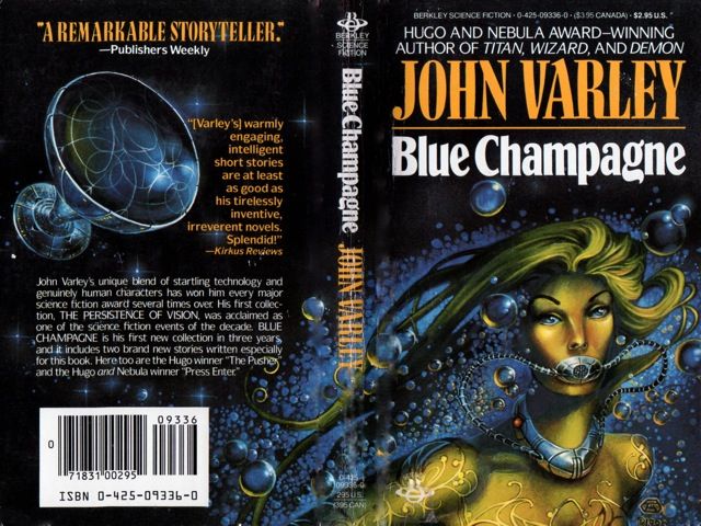 From the back cover: “John Varley’s unique blend of startling technology and genuinely human characters has won him every major science fiction award several times over. His first collection, THE PERSISTENCE OF VISION, was acclaimed as one of the science fiction events of the decade. BLUE CHAMPAGNE is his first new collection in three years, and it includes two brand new stories written especially for this book. Here too are the Hugo winner “The Pusher” and the Hugo and Nebula winner “Press Enter.”
