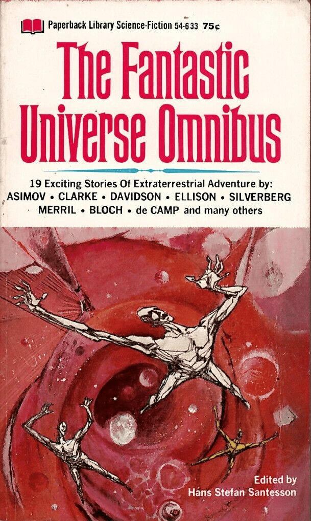 Jerome Podwil’s cover art for the 1968 edition of The Fantastic Universe Omnibus, ed. Hans Stefan Santesson (1960)