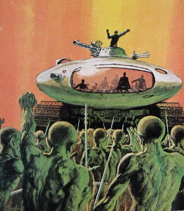 The influence is definitely what I’m interested in. And that entire immediate post-WWII moment in which beneath the pulpy exteriors — the paraphrase a discussion with Brian Collins (who stops by the site occasionally)–there’s a more serious grappling with revelations of the WWII (think Simak and his City stories) and commentary on contemporary issues.