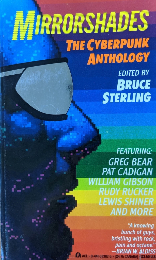 Uncredited cover for the 1988 edition of Mirrorshades: The Cyberpunk Anthology, ed. Bruce Sterling (1986)