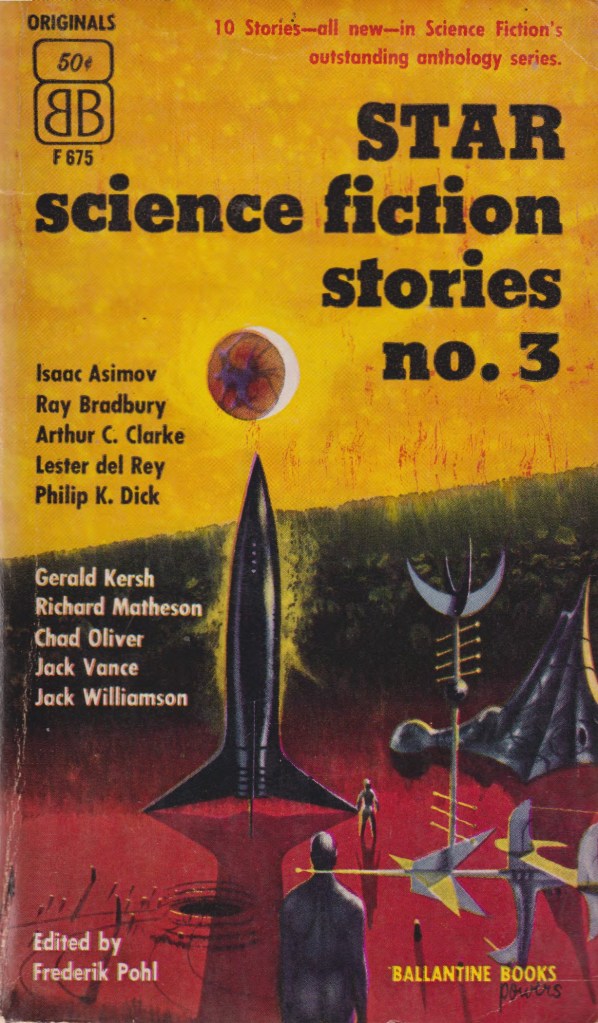 Ballantine Books’ illustrious science fictional program started with a bang–Star Science Fiction Stories. According to Mike Ashley’s Transformations: The Story of Science-Fiction Magazines from 1950 to 1970 Frederik Pohl’s anthology series of original (mostly) stories was “intended as both a showcase of Ballantine’s authors and a lure to new writers.” Paying better rates than magazines, the Star series foreshadowed the explosion of original anthologies that would provide a sustained challenge to the eminence held in the 50s by the magazine.
